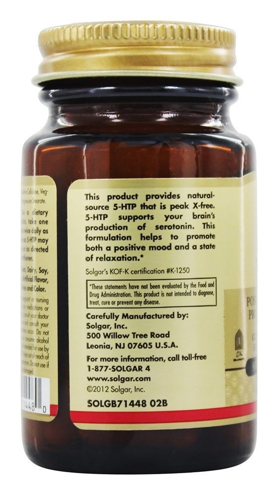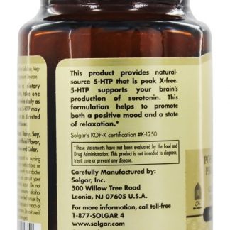 Solgar 5-HTP Positivo suporte de humor e relaxamento fornece 5-HTP de fonte natural com pico livre de X. 5-HTP suporta a produção de serotonina do seu cérebro. Juntamente com o extrato de vitamina B6, magnésio e raiz de valeriana, esta formulação ajuda a promover tanto um estado de ânimo positivo quanto um estágio de relaxamento.