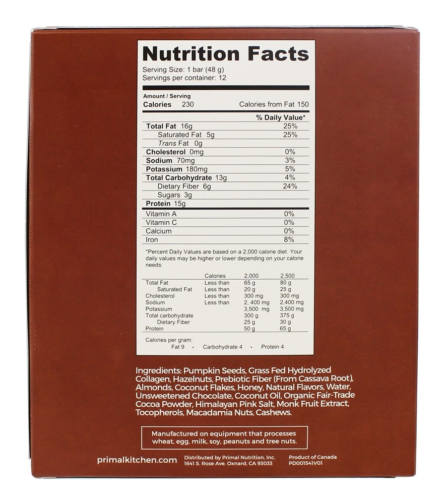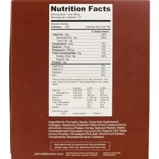 Ingredientes: Fibra de Tapioca Pré-biótica, Avelãs, Peptídeos de Colágeno Bovino, Cajus, Sementes de Abóbora, Clara de Ovos, Mel, Chocolate Desnatado, Cacau (Processado com Álcalis), Ovos, Água Extrato de Cacau, Extrato de Baunilha, Lecitina de Girassol, Sal Marinho, Extrato de Fruta de Monge, Extrato de Alecrim Contém: Ovo, nozes de árvore (castanha de caju, avelã) |