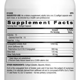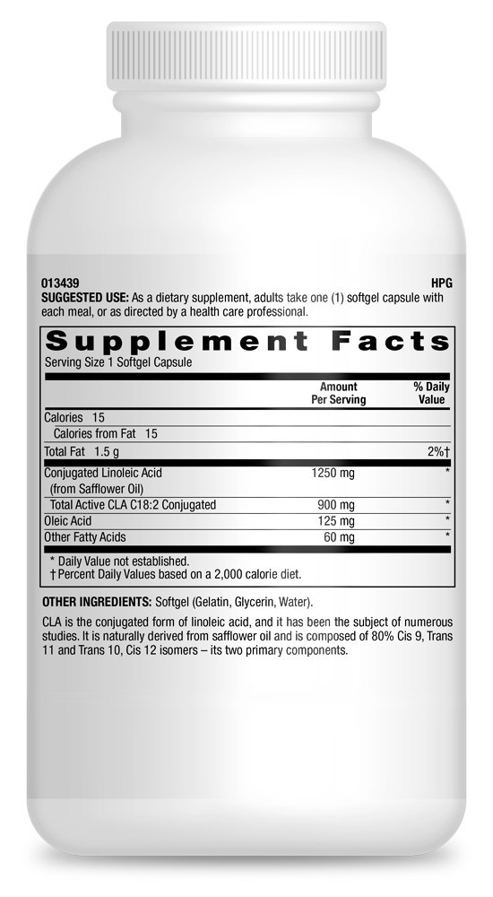 LuckyVitaminCLA de alta qualidade da 1,250 mcg. é a forma conjugada de ácido linoleico. A CLA tem sido o objeto de vários estudos que mostraram que ela apoia a massa muscular magra e a redução da gordura corporal. O CLA é naturalmente derivado do óleo de cártamo e é composto de 80 % Cis 9 , Trans 11 e Trans 10 , Cis 12 isômeros – seus dois componentes principais. LuckyVitamin tem o orgulho de oferecer CLA formulado sem açúcar, sal, sal, laticínios, fermento, trigo, glúten, milho, soja, conservantes, corantes ou aromatizantes artificiais. LuckyVitamin CLA foi auditado de forma independente por sua pureza e força para oferecer a mais alta qualidade, o melhor valor e, como sempre, uma garantia de satisfação.