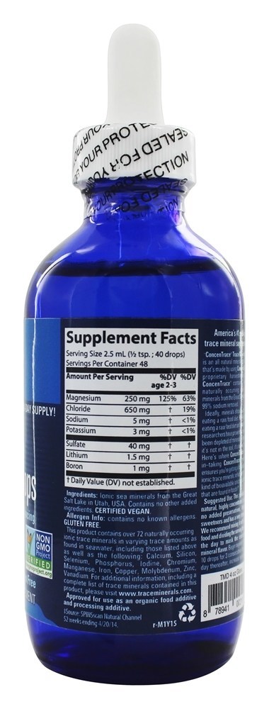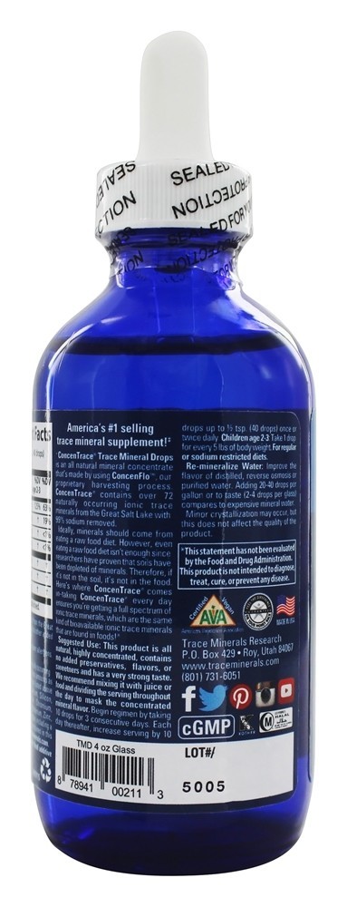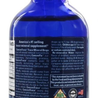 Trace Minerals Research Concentrace Traçar Mineral Gotas fornecer o a maioria poderoso, todos-natural ph-equilíbrio traçar minerais em o mundo. É impossível subestimar a importância dos minerais e minerais para o corpo humano. Eles são os catalisadores de todas as vitaminas e outros nutrientes que seu corpo usa para desenvolver e manter uma boa saúde. O ConcenTrace captura o equilíbrio perfeito desses minerais. Usar o ConcenTrace todos os dias (misturar com suco, comida ou remineralizar a água purificada) ajudará a conduzir e gerar todo o sistema elétrico do seu corpo. Você terá mais energia e geralmente se sentirá melhor. Concentrace Mineral Gotas conter sobre 72 traçar minerais, e são Kosher/Halal certificado, Vegan, e todos-natural de Utah Grande Sal Lago.