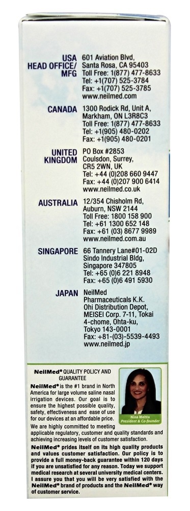 NeilMed se orgulha de produtos de qualidade e valoriza a satisfação do cliente. Sua política é fornecer uma garantia total de reembolso em até 120 dias se você não estiver satisfeito por qualquer motivo. Hoje eles apóiam a pesquisa médica em vários centros médicos universitários. Garanto-lhe que ficará muito satisfeito com a marca de produtos NeilMed e com a forma NeilMed de atendimento ao cliente.