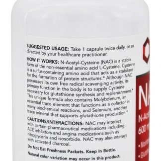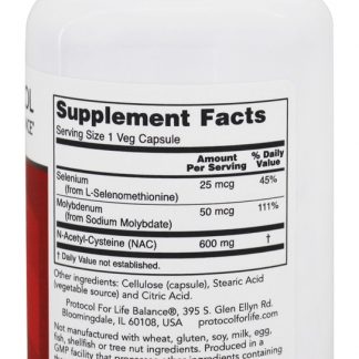 Protocol For Life Balance NAC é uma forma estável do aminoácido L-Cisteína não essencial. A cisteína é um aminoácido contendo enxofre que age como um estabilizador para a formação de estruturas proteicas. Embora o NAC possua sua própria atividade de remoção de radicais livres, sua principal função no organismo é fornecer cisteína necessária para a síntese e reposição de glutationa. Esta fórmula única também contém Molibdênio, um oligoelemento essencial que funciona como cofator em muitas reações bioquímicas, e Selênio, outro mineral que suporta a produção de glutationa.