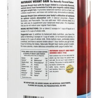 Melhore a sua absorção de calorias com as enzimas adicionadas do ganho de peso de Naturade . Naturade adicionaram 3 enzimas naturais – papaína, bromelaína e pancreatina para maximizar a absorção de calorias e aumentar os benefícios do ganho de peso de Naturade. Simplesmente beba antes do meio-dia, de preferência antes de um treino, e faça um segundo batido por cerca de 1 hora antes de ir para a cama. Se você está limitando a ingestão de gordura, Naturade O ganho de peso tem um ótimo sabor na água. Para mais calorias, faça deliciosos smoothies com sorvete e / ou frutas. Tem um sabor excelente e é fácil de preparar!