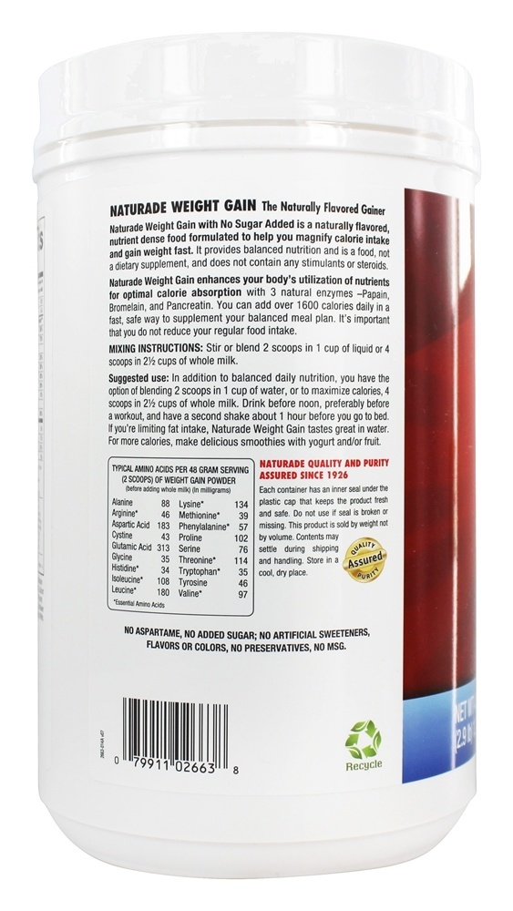 Naturade Peso Ganhar Instante Nutrição Beber Misturar Baunilha vontade maximizar sua caloria consumo e ajudar você massa-acima. Embalado com proteínas, carboidratos e calorias, Naturade O Ganho de Peso aumentará sua rotina de treinamento físico e musculação e proporcionará mais massa e energia. Um total de 21 gramas de carboidratos por porção aumentará seu sistema e o perfil completo de aminoácidos manterá você energizado. Dois 16 oz. shakes irá adicionar até 1500 todas as calorias naturais ao seu plano de refeições equilibrado – um grande elogio ao seu programa de ganho de peso. Tenha certeza, Naturade Ganho de peso é estimulante e livre de esteróides e não tem adição de açúcar – simplesmente, ganho natural. Fisiculturistas e atletas desfrutam de Naturade Ganho de peso porque aumentam a utilização de nutrientes pelo corpo para uma ótima absorção de calorias.