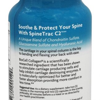 Uma dose diária de Health Logics Spinetrac C2 inclui 2.000mg de BioCell Collagen patenteado e biodisponível, 750mg de sulfato de glucosamina e 80mg de extratos herbais antioxidantes. SpineTrac C2 é mais potente que a glucosamina e a condroitina sozinhas, porque contém todos os componentes essenciais da cartilagem saudável, o tecido amortecedor encontrado em sua coluna vertebral.